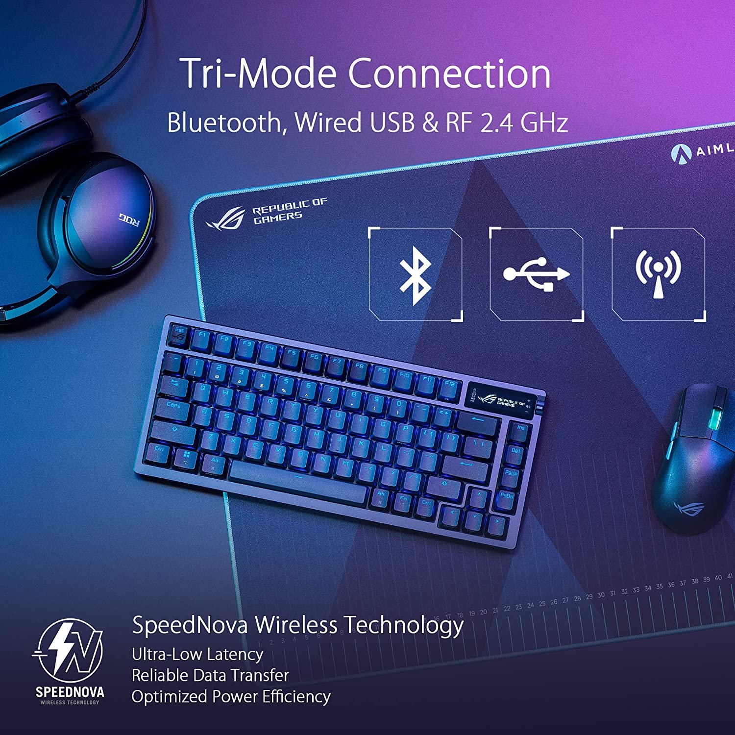 • Tri-mode connection: Use Bluetooth to connect and switch between three devices at a time, ROG SpeedNova wireless technology provides up to 2,000+ hours of low-latency gameplay in 2.4 GHz RF wireless mode (OLED & RGB off), or use standard wired USB