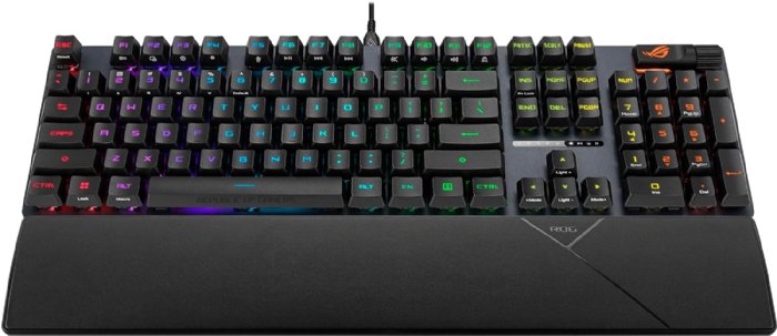 ASUS ROG Strix Scope II Gaming Keyboard, pre-lubed ROG RX Blue clicky Optical switches, Sound-dampening Foam, PBT doubleshot keycaps, Streaming hotkeys, Multi-Function Controls, Wrist Rest