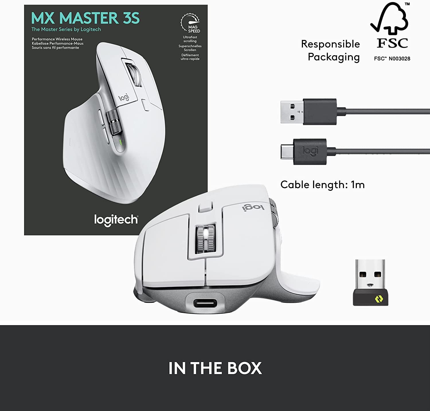 Logitech MX Master 3S - Wireless Performance Mouse with Ultra-fast Scrolling, Ergo, 8K DPI, Track on Glass, Quiet Clicks, USB-C, Bluetooth, Windows, Linux, Chrome...(Pale Grey)