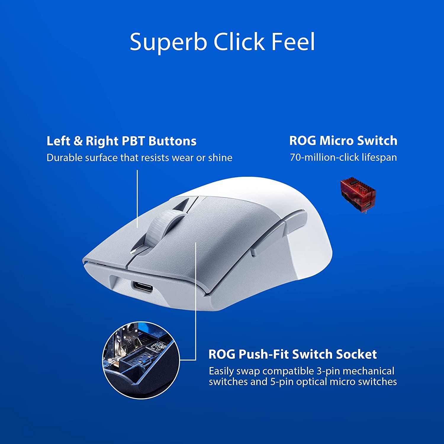 • Push-Fit Switch Socket II: Swappable switch design for easy customization; Keris AimPoint includes ROG Micro Switches and is compatible with other 3-pin mechanical and 5-pin optical micro switches
