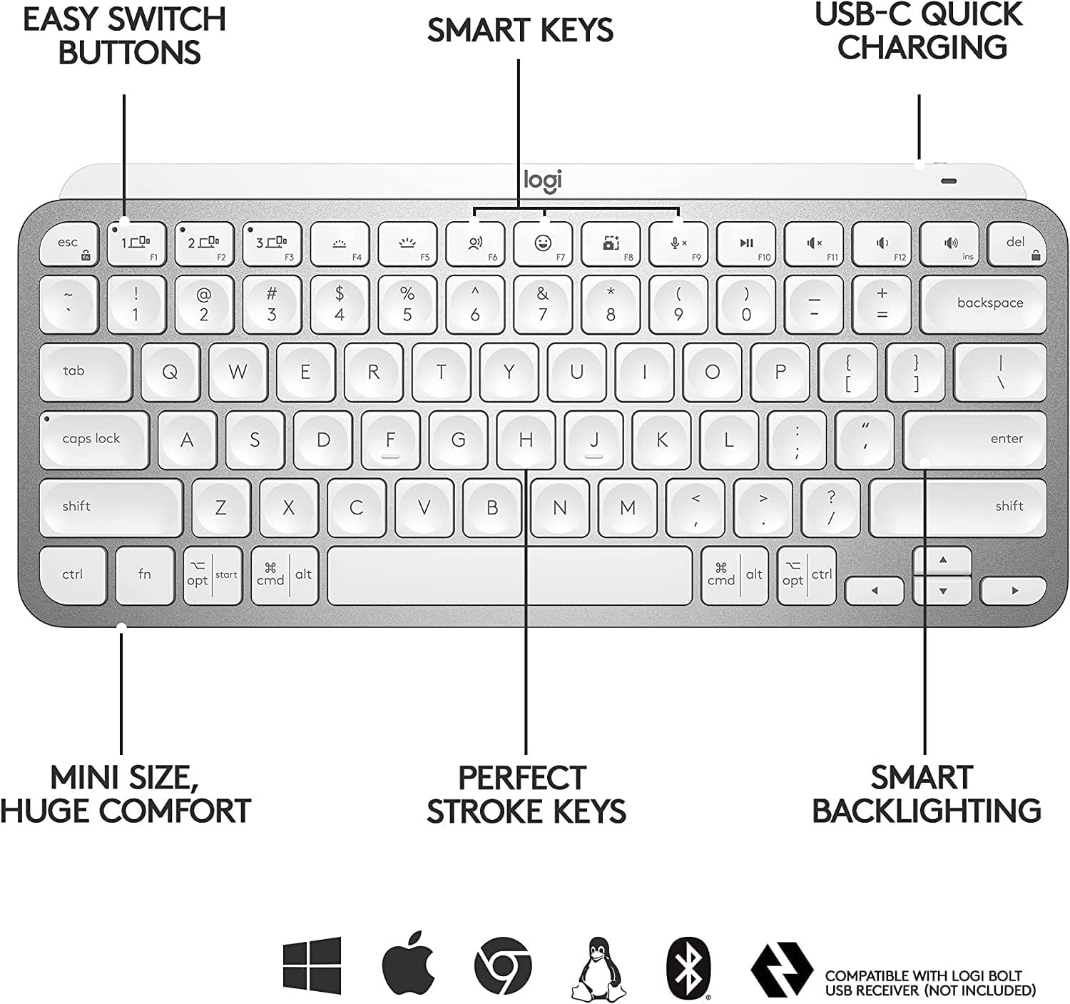 Logitech MX Keys Mini Minimalist Wireless Illuminated Keyboard, Compact, Bluetooth, Backlit, USB-C, Compatible with Apple macOS, iOS, Windows, Linux, Android, Metal Build... (Pale Grey)